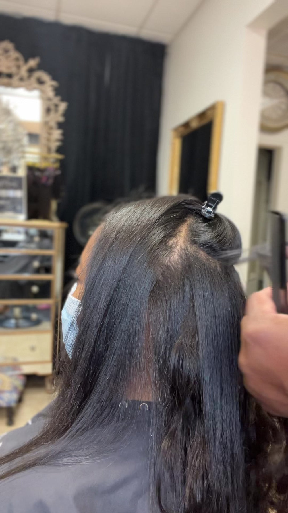 Disclaimer- Professionally installed by a licensed cosmetologist is best. The extensions must be applied to clean hair to ensure that the adhesive sticks on the client’s hair. Once the hair is straightened or blown out, the hairstylist will install extensions with the client’s hair in between.